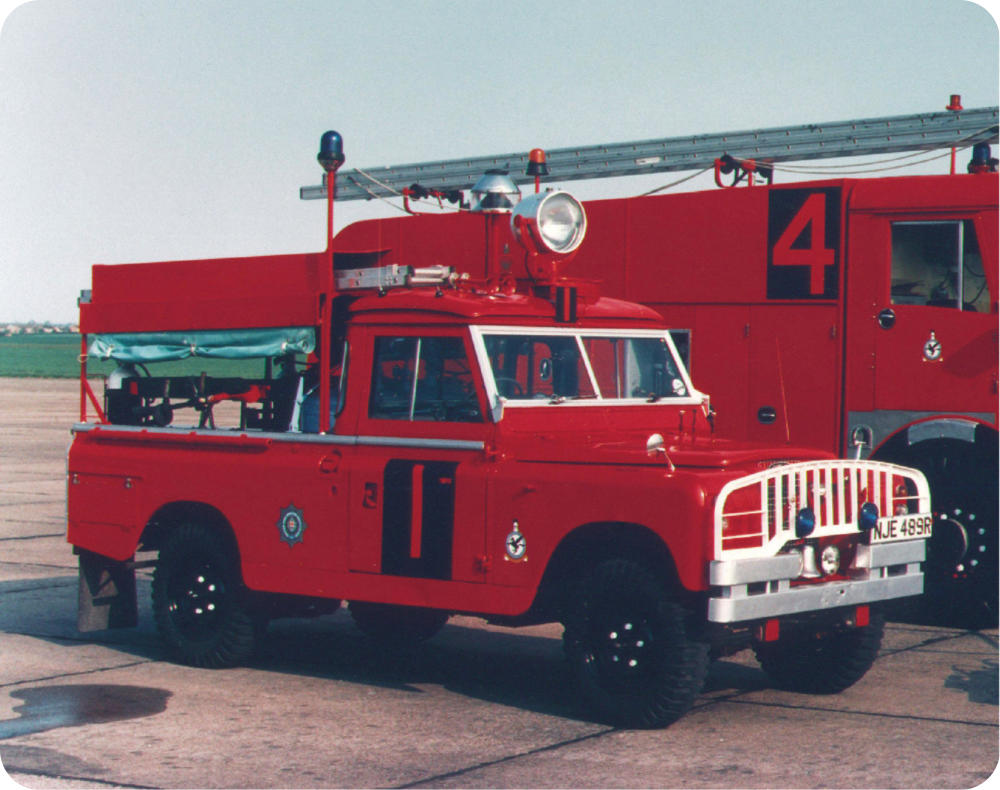 After this humble beginning, the fire crew, now under the auspices of the Duxford Aviation Society grew fairly rapidly, with the second fire appliance, a Landrover ACR(T)II, NJE489R being acquired in 1976. This appliance had previously served in the Royal Air Force,